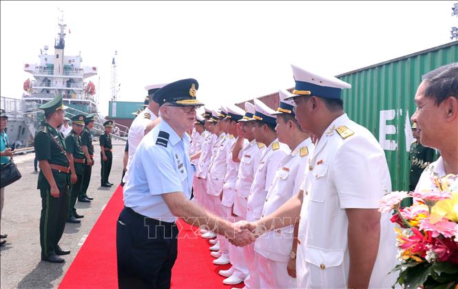 Các sỹ quan hải quân Việt Nam đón Chuẩn tướng Tony McCormack (trái), Chỉ huy Chương trình Nỗ lực Ấn Độ Dương- Thái Bình Dương của Australia (IPE). Ảnh: TTXVN |
