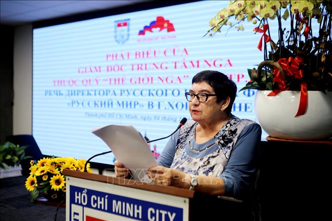 Bà Natalia Borisovna Zolkina, Giám đốc Trung tâm Nga thuộc Quỹ "Thế giới Nga" tại TP Hồ Chí Minh phát biểu tại buổi họp mặt. Ảnh: Thành Chung/ TTXVN |