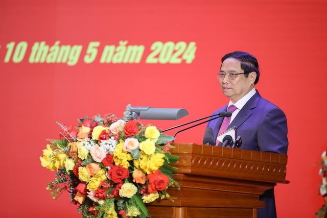 Thủ tướng Phạm Minh Chính phát biểu chúc mừng cán bộ, chiến sĩ Binh đoàn 12-Tổng Công ty Xây dựng Trường Sơn. Ảnh: VGP/Nhật Bắc |