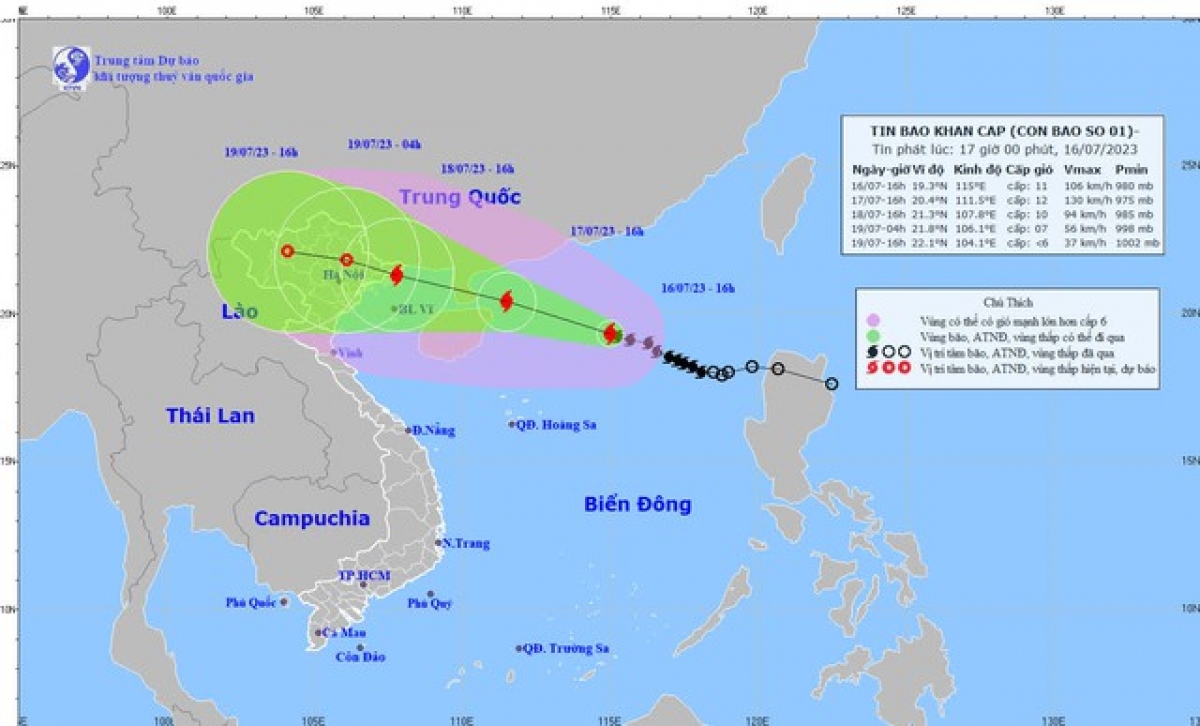 Bão số 1 (tên quốc tế là TALIM) đang hoạt động ở phía Tây Bắc khu vực Bắc Biển Đông với sức gió mạnh cấp 10, giật cấp 13. Theo dự báo, bão số 1 còn tiếp tục mạnh lên cấp 12-13, giật cấp 15, từ chiều mai (ngày 17/7) bão có thể sẽ gây gió mạnh trên Vịnh Bắc Bộ, sau đó tiếp tục ảnh hưởng đến vùng biển ven bờ và đất liền ven biển Bắc Bộ, hoàn lưu bão có thể gây mưa lớn kéo dài, nhất là tại khu vực phía Đông Bắc Bộ và Đồng bằng sông Hồng, nguy cơ cao xảy ra sạt lở đất, lũ quét tại miền núi, ngập úng cục bộ tại các đô thị và vùng thấp trũng, ven sông, suối.