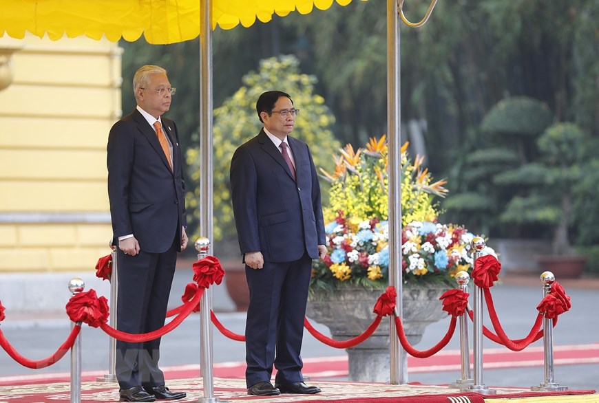 Thủ tướng Phạm Minh Chính và Thủ tướng Malaysia Dato’ Sri Ismail Sabri bin Yaakob nghe quân nhạc cử Quốc thiều hai nước. Ảnh: TTXVN |