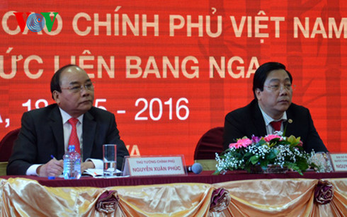 Tại đây, thông báo với bà con về kết quả hội đàm, hội kiến, gặp gỡ với các nhà lãnh đạo Nga, Thủ tướng Nguyễn Xuân Phúc khẳng định qua các cuộc tiếp xúc, lãnh đạo hai nước đánh giá cao quan hệ hợp tác Việt Nam – Liên bang Nga thời gian qua đã có những bước chuyển mạnh mẽ, ngày càng năng động và hiệu quả trên nhiều lĩnh vực. Hai bên nhất trí triển khai đồng bộ các biện pháp như tạo điều kiện thuận lợi cho các doanh nghiệp hai nước trong các hoạt động xuất nhập khẩu, tăng cường hoạt động xúc tiến thương mại và nhất là tranh thủ tối đa những lợi thế của Hiệp định Thương mại tự do Việt Nam - Liên minh Kinh tế Á - Âu cũng như của các Hiệp định thương mại tự do mà Việt Nam tham gia.