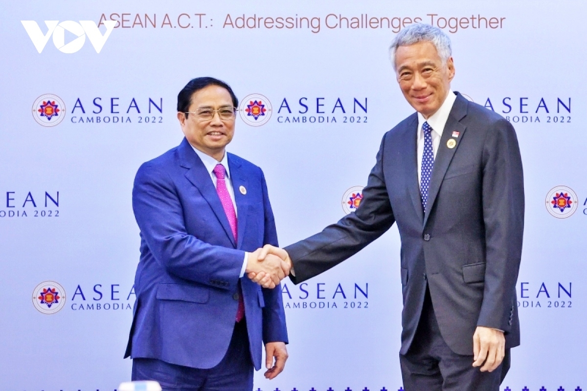 Thủ tướng Singapore Lý Hiển Long gặp gỡ Thủ tướng Chính phủ Phạm Minh Chính nhân dịp tham dự Hội nghị Cấp cao ASEAN lần thứ 40, 41 và các hội nghị cấp cao liên quan. Ảnh: VOV |