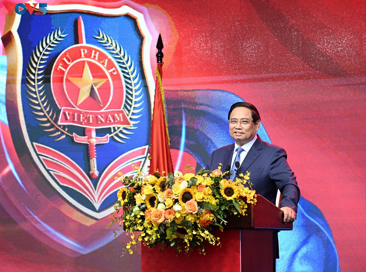 Thủ tướng Phạm Minh Chính phát biểu tại Lễ kỷ niệm 80 năm Ngày truyền thống ngành Tư pháp. Ảnh: Lại Hoa/VOV |