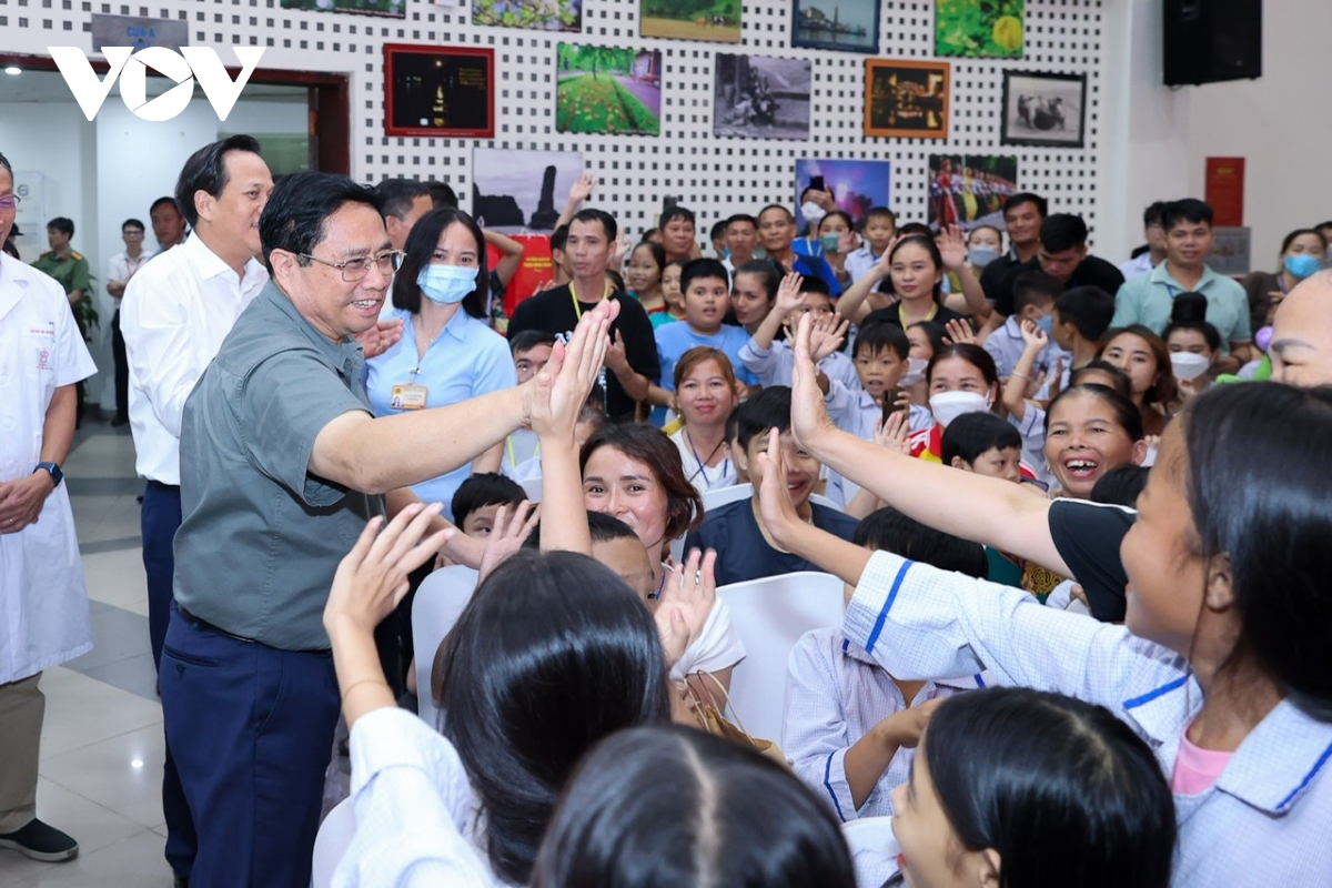Thủ tướng Phạm Minh Chính động viên tinh thần các bệnh nhi đang được chăm sóc, điều trị tại bệnh viện. Ảnh: VOV |