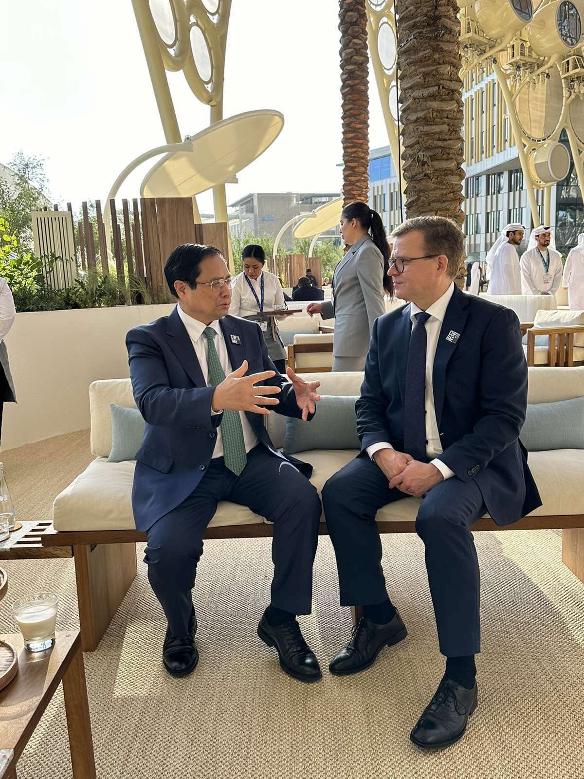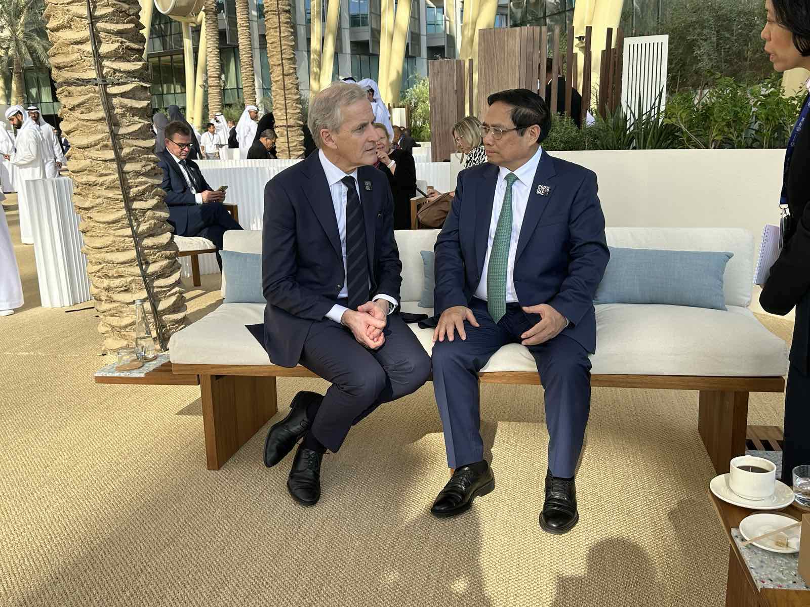 Chiều nay (1/12, theo giờ địa phương), tại thành phố Dubai (UAE), nhân dịp tham dự Hội nghị thượng đỉnh hành động khí hậu thế giới trong khuôn khổ Hội nghị lần thứ 28 các bên tham gia Công ước khung về biến đổi khí hậu của Liên hợp quốc (COP28), Thủ tướng Chính phủ Phạm Minh Chính đã có các cuộc tiếp xúc song phương với Lãnh đạo cấp cao các nước Hà Lan, Đan Mạch, UAE, Na Uy, Ấn Độ, Mông Cổ, Zambia, lãnh đạo Quỹ Tiền tệ quốc tế (IMF) và Tổ chức Thương mại thế giới (WTO); gặp cựu Thủ tướng Anh, Tony Blair và Đặc phái viên về khí hậu của Tổng thống Mỹ, John Kerry.