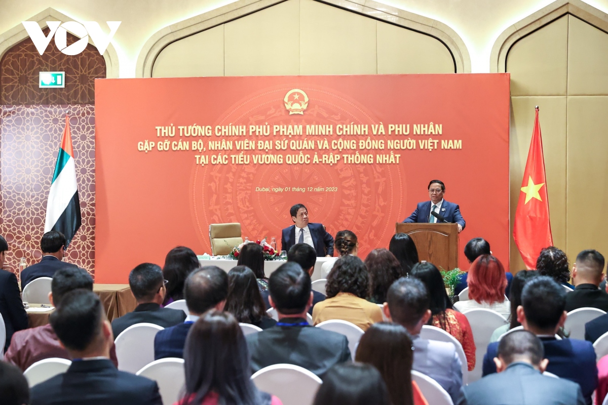 Trong chương trình hoạt động song phương tại Các Tiểu vương quốc Arab thống nhất (UAE), tối 1/12, tại Dubai, Thủ tướng Phạm Minh Chính và Phu nhân Lê Thị Bích Trân cùng đoàn đại biểu Việt Nam gặp gỡ cán bộ, nhân viên Đại sứ quán và cộng đồng người Việt Nam tại UAE.