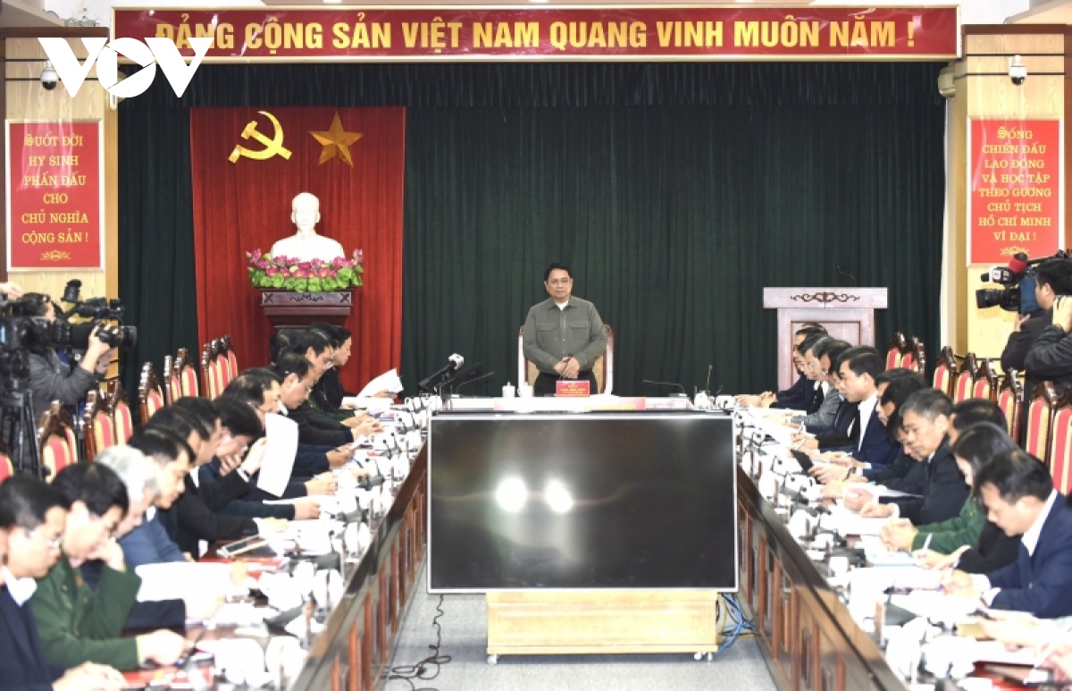 Thủ tướng Phạm Minh Chính chủ trì cuộc làm việc với lãnh đạo hai tỉnh Tuyên Quang, Phú Thọ và các bộ, ngành liên quan về tuyến cao tốc Tuyên Quang - Phú Thọ. Ảnh: VOV |