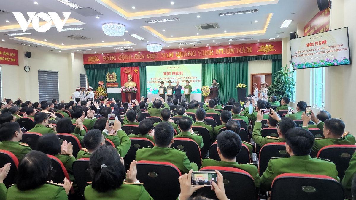 Hội nghị sơ kết các chuyên án điển hình về ma túy và trao tặng Thư khen cho Cục cảnh sát phòng chống tội phạm về ma túy, Bộ Công an. Ảnh: VOV |