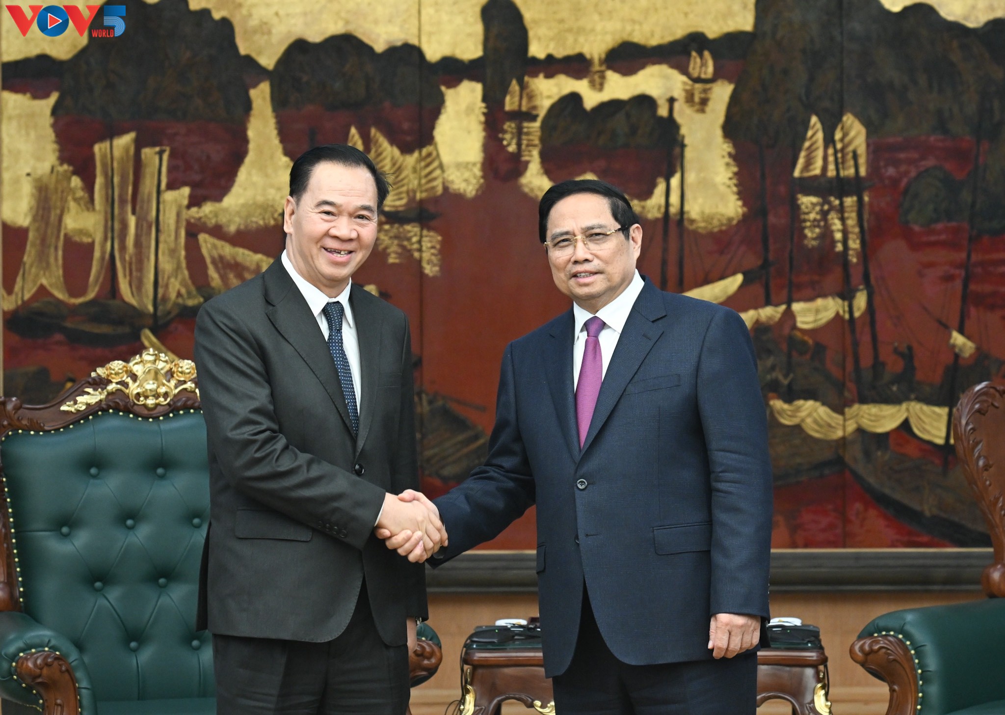 Thủ tướng Chính phủ Phạm Minh Chính và Bí thư Trung ương Đảng, Bộ trưởng Bộ Giáo dục và Thể thao Cộng hoà dân chủ nhân dân Lào Thongsalith Mangnormek. Ảnh: VOV |