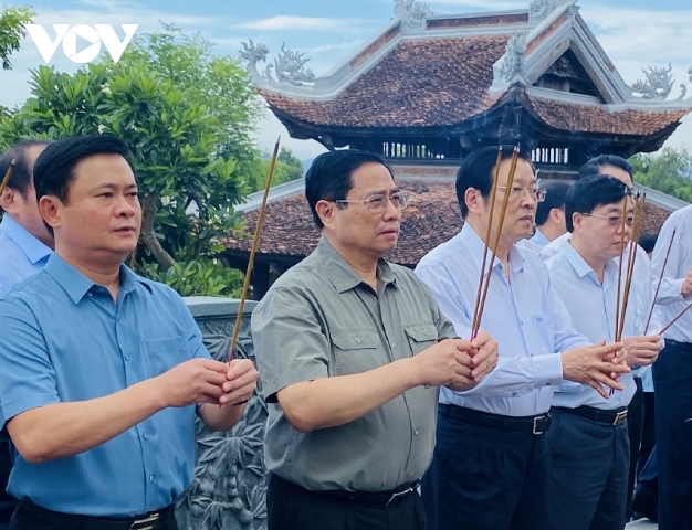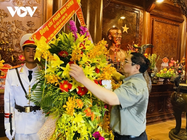 Dâng hoa, dâng hương tại Đền Chung Sơn và dâng hoa, dâng hương tưởng niệm Chủ tịch Hồ Chí Minh tại Khu Di tích lịch sử Quốc gia đặc biệt Kim Liên (xã Kim Liên, huyện Nam Đàn), Thủ tướng Phạm Minh Chính và Đoàn công tác tỏ lòng tưởng nhớ công ơn to lớn của Chủ tịch Hồ Chí Minh với sự nghiệp cách mạng giải phóng dân tộc, giải phóng giai cấp, đấu tranh cho sự nghiệp hòa bình và hạnh phúc của dân tộc Việt Nam và nhân dân trên thế giới.