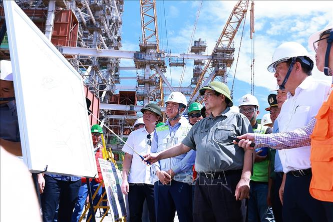 Thủ tướng Phạm Minh Chính kiểm tra tiến độ thi công Nhà máy Nhiệt điện Quảng Trạch 1 (xã Quảng Đông, huyện Quảng Trạch). Ảnh: TTXVN |