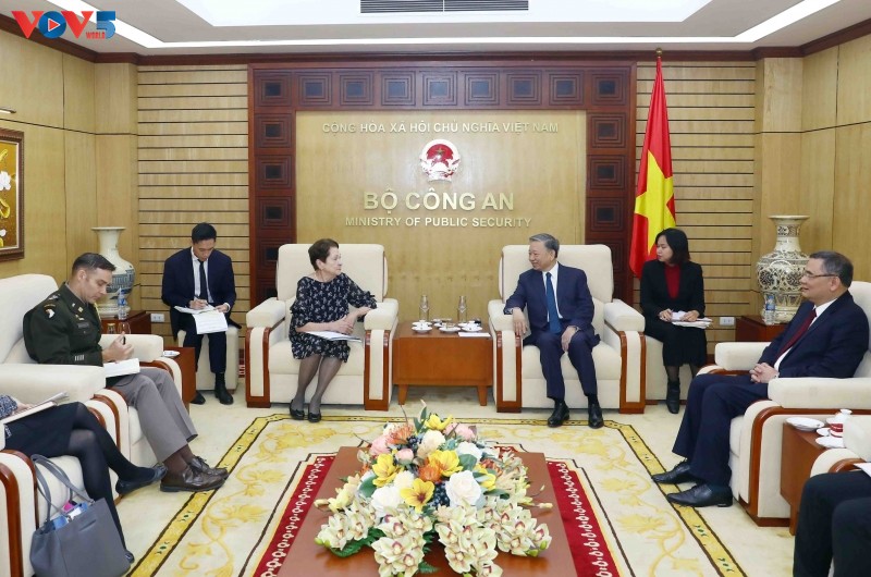 Bộ Trưởng Tô Lâm tiếp bà Ann Mills Griffith, Giám đốc Liên đoàn quốc gia các gia đình tù nhân chiến tranh và quân nhân mất tích Hoa Kỳ. Ảnh: Việt Cường/ VOV |
