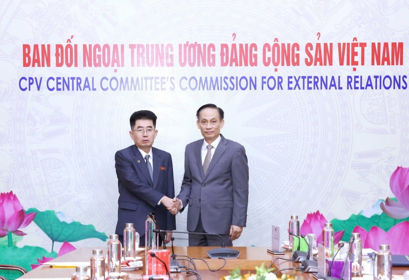 Trưởng Ban Đối ngoại Trung ương Lê Hoài Trung và Trưởng Ban Quốc tế Đảng Lao động Triều Tiên, Chủ tịch Ủy ban Đối ngoại Hội nghị Nhân dân Tối cao Triều Tiên Kim Song Nam. Ảnh: Phương Hoa/TTXVN |