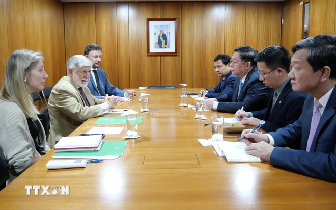 Trưởng Ban Tuyên giáo Trung ương Nguyễn Trọng Nghĩa và Đoàn chào xã giao ông Celso Amorim, cố vấn đặc biệt của Tổng thống Lula da Silva. Ảnh: Diệu Hương/TTXVN |