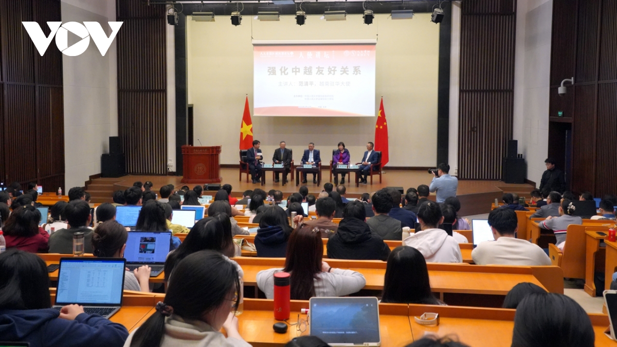 Đại sứ Phạm Thanh Bình chia sẻ về quan hệ Việt - Trung tại Đại học Nhân dân Trung Quốc. Ảnh: Trung Kiên/VOV-Bắc Kinh |