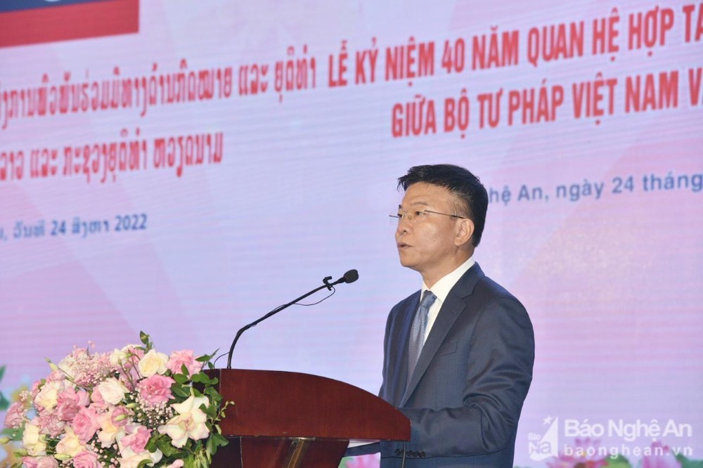 Bộ trưởng Bộ Tư pháp Việt Nam Lê Thành Long phát biểu tại Lễ kỷ niệm. Ảnh: Báo Nghệ An |