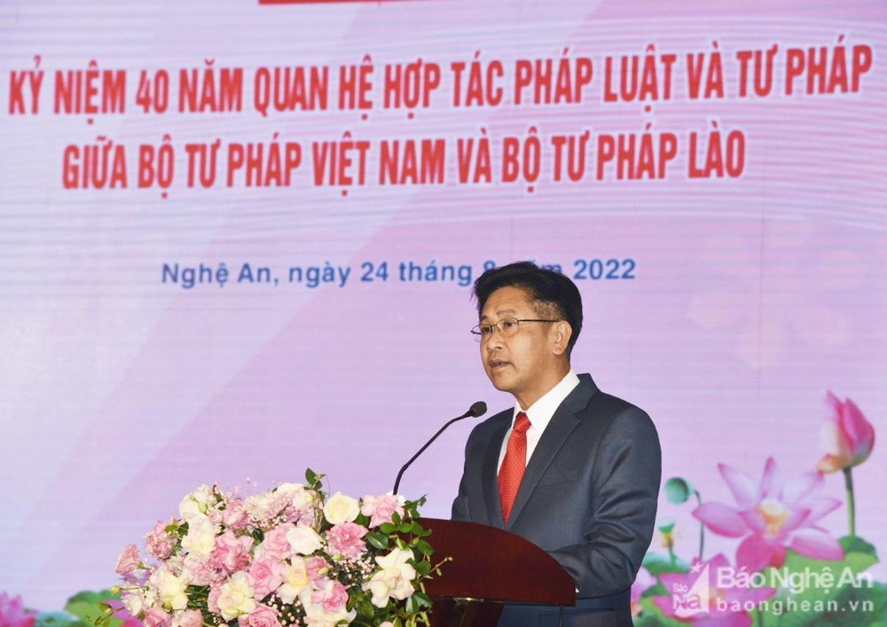 Bộ trưởng Bộ Tư pháp Lào Phayvy Siboualypha phát biểu tại Lễ kỷ niệm. Ảnh: Báo Nghệ An |