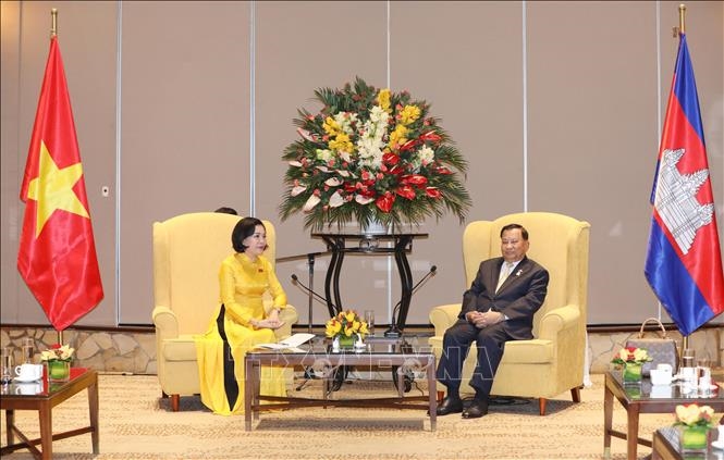 Chủ tịch Hội Hữu nghị Việt Nam - Campuchia Nguyễn Thị Thanh chào xã giao Chủ tịch Thượng viện Vương quốc Campuchia Samdech Say Chhum. Ảnh: Phương Hoa/TTXVN |