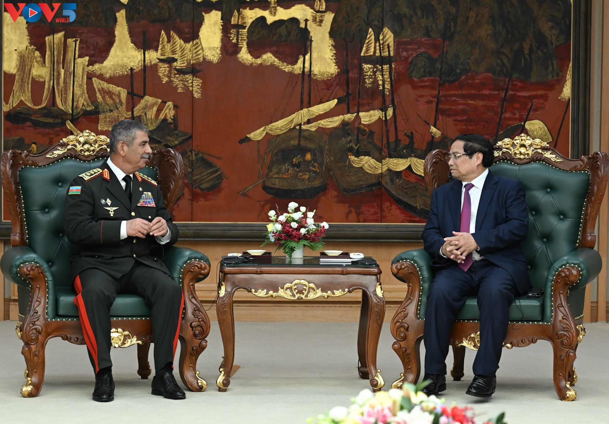 Tối qua (04/09), tại Trụ sở Chính phủ (Hà Nội), Thủ tướng Phạm Minh Chính tiếp Bộ trưởng Bộ Quốc phòng Azerbaijan, Thượng tướng Zakir Hasanov và các thành viên đoàn sang thăm chính thức Việt Nam, tham dự lễ kỷ niệm 80 năm Cách mạng tháng Tám thành công và Quốc khánh 2/9.