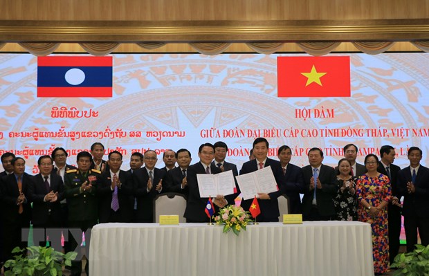 Lãnh đạo tỉnh Đồng Tháp và Champasak ký kết Biên bản ghi nhớ hợp tác. Ảnh: Nhựt An/TTXVN |