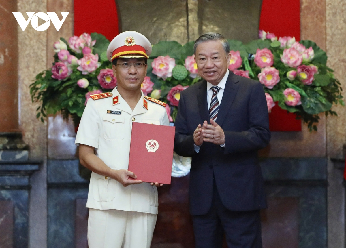 Tổng Bí thư, Chủ tịch nước Tô Lâm trao quyết định bổ nhiệm ông Hồ Đức Anh, Kiểm sát viên Viện Kiểm sát nhân dân tối cao, Vụ trưởng Vụ Thực hành quyền công tố và kiểm sát điều tra án kinh tế, giữ chức vụ Phó Viện trưởng Viện Kiểm sát nhân dân tối cao. Ảnh: VOV |