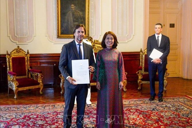 Đại sứ Việt Nam tại Argentina, kiêm nhiệm Uruguay, Ngô Minh Nguyệt trình Thư ủy nhiệm của Chủ tịch nước Lương Cường lên Tổng thống Uruguay Luis Lacalle Pou, ngày 7/1. Ảnh: Phủ Tổng thống Uruguay/TTXVN |