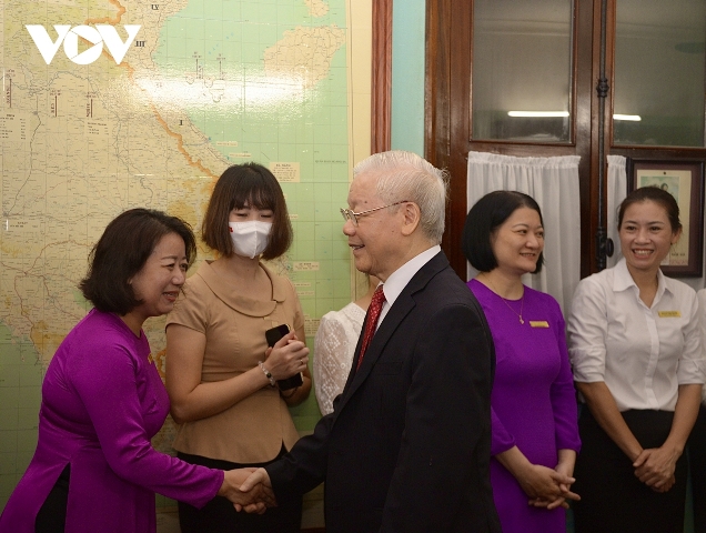 Tổng Bí thư Nguyễn Phú Trọng gặp gỡ cán bộ nhân viên Khu di tích. Ảnh: VOV |
