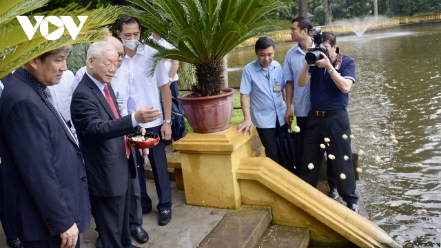 Tổng Bí thư Nguyễn Phú Trọng cho cá ăn tại ao cá Bác Hồ trong Khu Di tích Chủ tịch Hồ Chí Minh tại Phủ Chủ tịch. Ảnh: VOV |