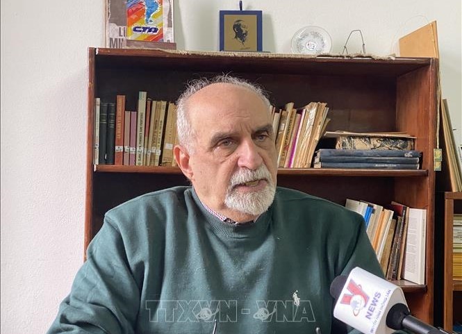 Tổng Bí thư Đảng Cộng sản Argentina Jorge Kreyness trả lời phỏng vấn của phóng viên TTXVN. Ảnh: Ngọc Tùng/PV TTXVN tại Argentina |