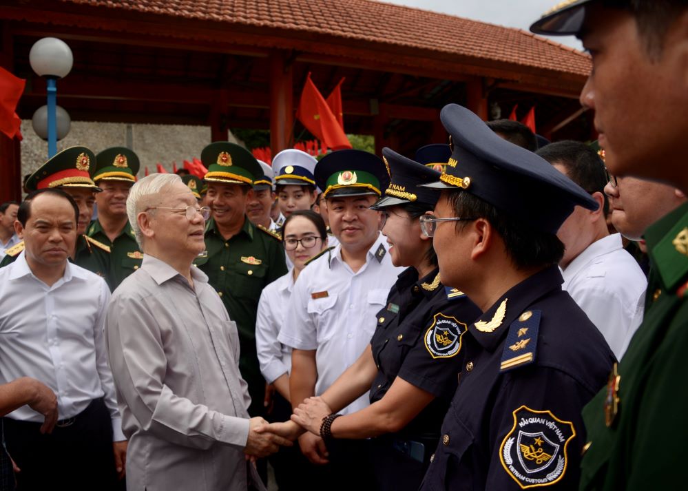 Tại đây, Tổng Bí thư Nguyễn Phú Trọng thăm, tặng quà lực lượng liên ngành làm việc tại khu vực cửa khẩu.