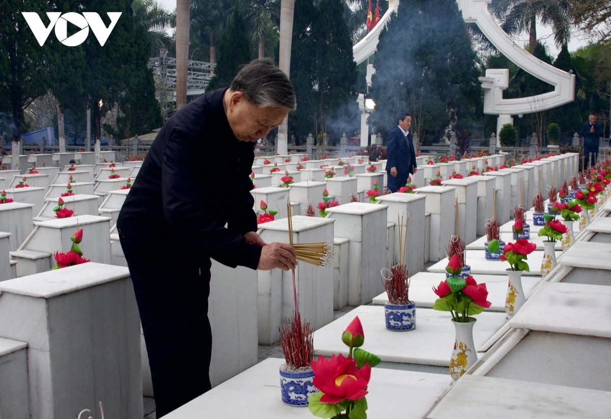 (VOV5) - Hôm nay (5/2, tức mùng 8 tháng Giêng), Tổng Bí thư Tô Lâm tới nghĩa trang liệt sĩ Quốc gia Vị Xuyên, Hà Giang dâng hương tưởng nhớ và tri ân các anh hùng liệt sĩ.