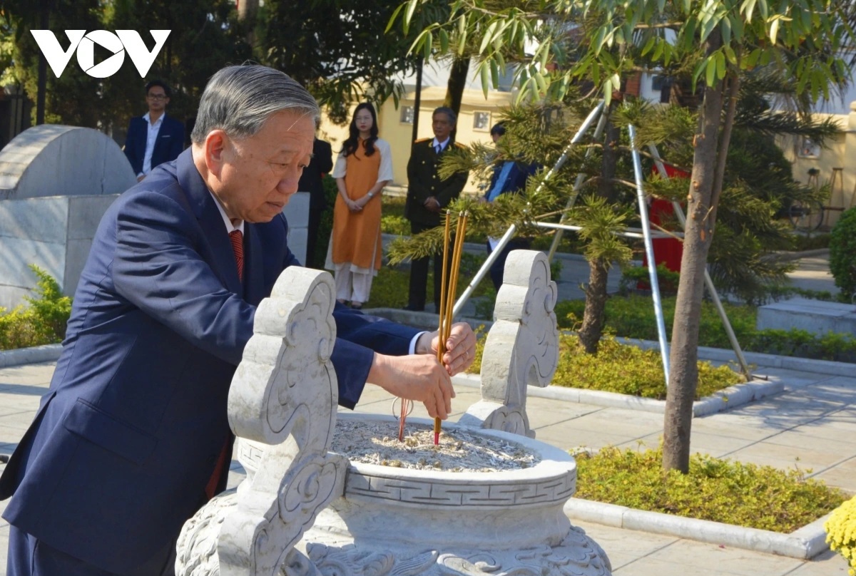 Tổng Bí thư Tô Lâm dâng hương tưởng niệm Tổng Bí thư Nguyễn Văn Cừ - Ảnh: VOV |