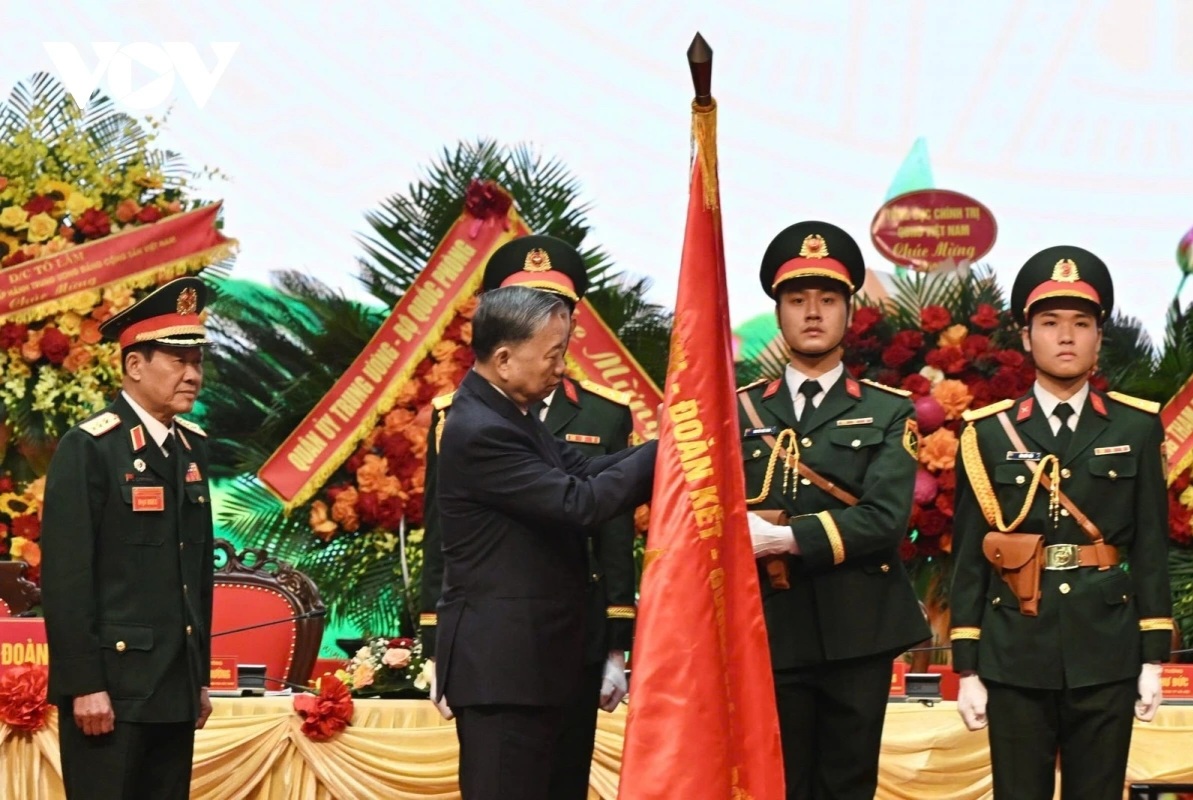 Tổng Bí thư Tô Lâm gắn Huân chương Lao động Hạng nhất lên lá cờ truyền thống của Hội cựu chiến binh Việt Nam. Ảnh: VOV |