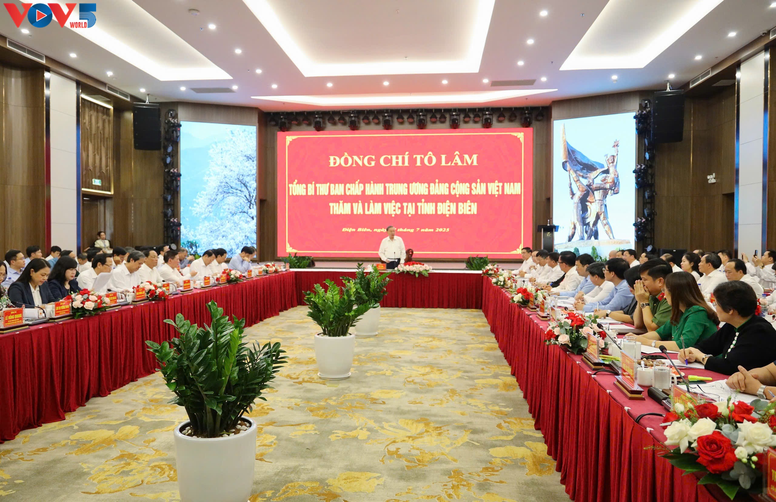 Chiều nay (27/7), tại tỉnh Điện Biên, Tổng Bí thư Tô Lâm và Đoàn công tác Trung ương làm việc với Ban Chấp hành Đảng bộ tỉnh Điện Biên về tình hình và kết quả triển khai, thực hiện các nghị quyết, kết luận của Trung ương gần đây, công tác lãnh đạo phát triển kinh tế - xã hội, bảo đảm quốc phòng, an ninh, an sinh xã hội trên địa bàn tỉnh.