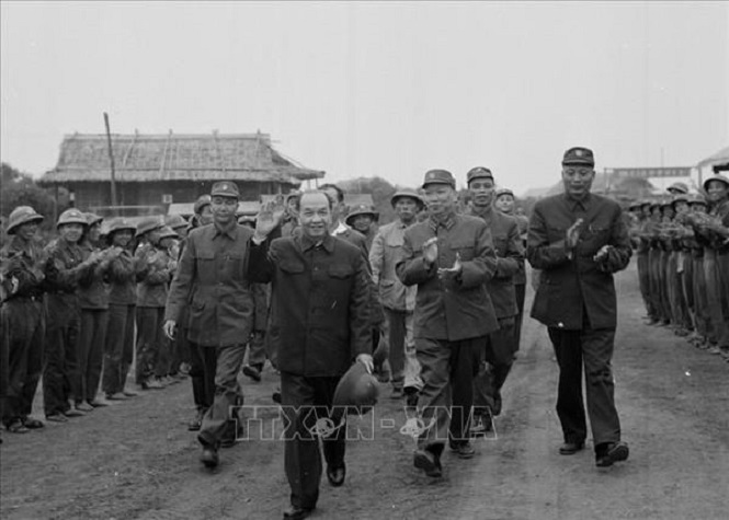 Tổng Bí thư Trường Chinh chúc Tết bộ đội Trường Sơn, Xuân Giáp Dần (1974). Ảnh: Lâm Hồng/TTXVN |