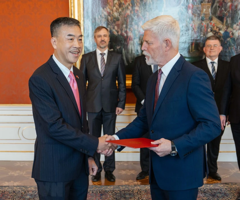 Đại sứ Dương Hoài Nam trình Thư ủy nhiệm của Chủ tịch nước Võ Văn Thưởng lên Tổng thống Cộng hòa Czech Petr Pavel - Ảnh: TTXVN |