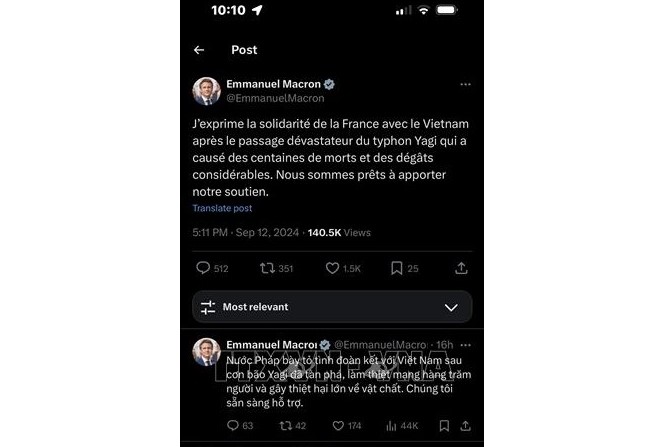 Hôm qua (13/9), trên trang cá nhân mạng xã hội X, Tổng thống Pháp Emmanuel Macron đã viết “Nước Pháp bày tỏ tình đoàn kết với Việt Nam sau khi cơn bão Yagi tàn phá, làm thiệt mạng hàng trăm người và gây thiệt hại lớn về vật chất. Chúng tôi sẵn sàng hỗ trợ các bạn”. Cũng trong thời gian này, nhiều tờ báo ở Pháp đã đăng tin về những thiệt hại về người và tài sản, cũng như những hậu quả của bão lũ mà người dân Việt Nam đã và đang phải gánh chịu.