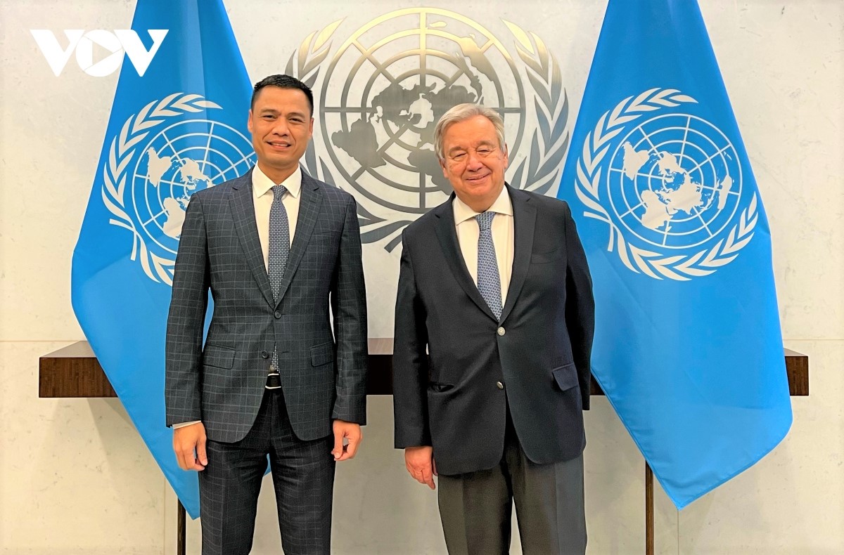 Tổng Thư ký Liên Hợp Quốc António Guterres và Đại sứ Đặng Hoàng Giang, Trưởng Phái đoàn thường trực Việt Nam tại Liên Hợp Quốc. Ảnh: VOV |