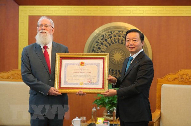 Phó Thủ tướng, Bộ trưởng Bộ Tài nguyên và Môi trường Trần Hồng Hà trao Huy chương Hữu nghị cho tiến sỹ Michael Parsons. Ảnh: Hoàng Hiếu/TTXVN |