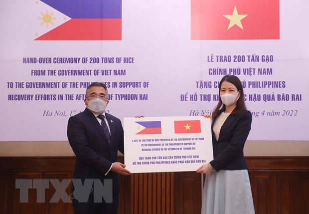 Chiều 1/4, tại trụ sở Bộ Ngoại giao, Trợ lý Bộ trưởng Ngoại giao Nguyễn Minh Hằng đã trao (tượng trưng) 200 tấn gạo, trị giá gần 100.000 USD - quà tặng của Chính phủ và nhân dân Việt Nam gửi tặng Chính phủ, nhân dân Philippines để hỗ trợ khắc phục hậu quả bão Rai.