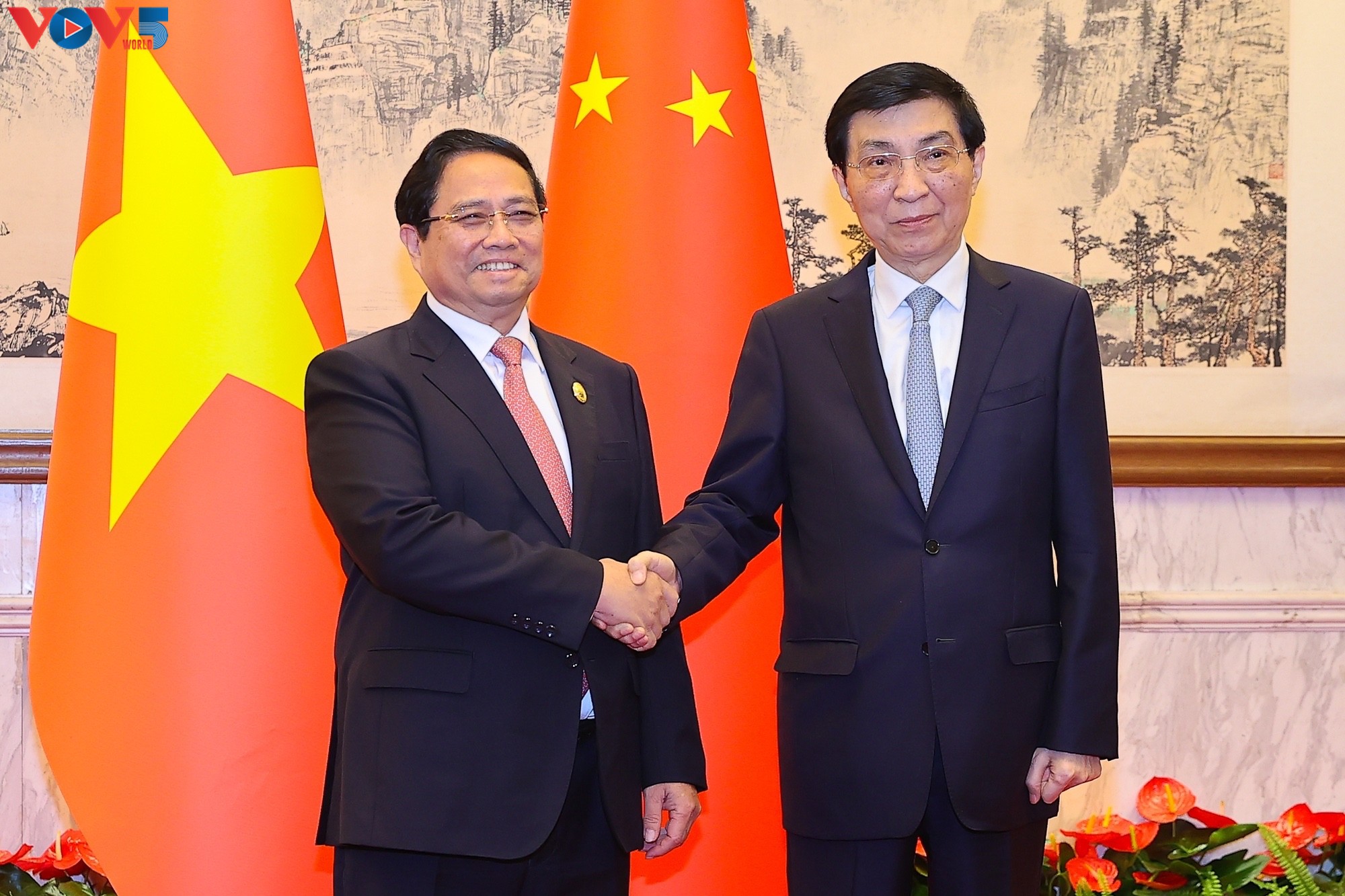 Thủ tướng Phạm Minh Chính hội kiến ông Vương Hộ Ninh, Ủy viên Thường vụ Bộ Chính trị, Chủ tịch Chính hiệp toàn quốc Trung Quốc. Ảnh: VOV |