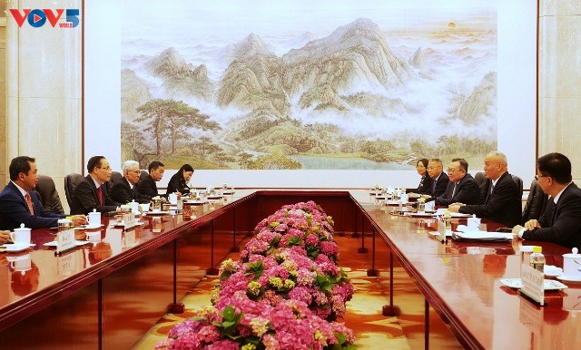Về phía Trung Quốc, Chánh Văn phòng Trung ương Đảng Cộng sản Trung Quốc, Thái Kỳ, khẳng định Trung Quốc ủng hộ Việt Nam phát huy vai trò lớn hơn tại khu vực và trên trường quốc tế, nâng cao tiếng nói của các nước đang phát triển trong giải quyết các vấn đề quốc tế. Trong khi đó, Bộ trưởng Bộ Ngoại giao Trung Quốc, Vương Nghị, đề nghị hai bên tiếp tục phối hợp thúc đẩy các lĩnh vực giao lưu, hợp tác ở tất cả các cấp, các ngành ngày càng hiệu quả, cân bằng, bền vững; nỗ lực duy trì hòa bình, ổn định và kiểm soát, xử lý tốt các vấn đề bất đồng trên biển theo nhận thức chung cấp cao.