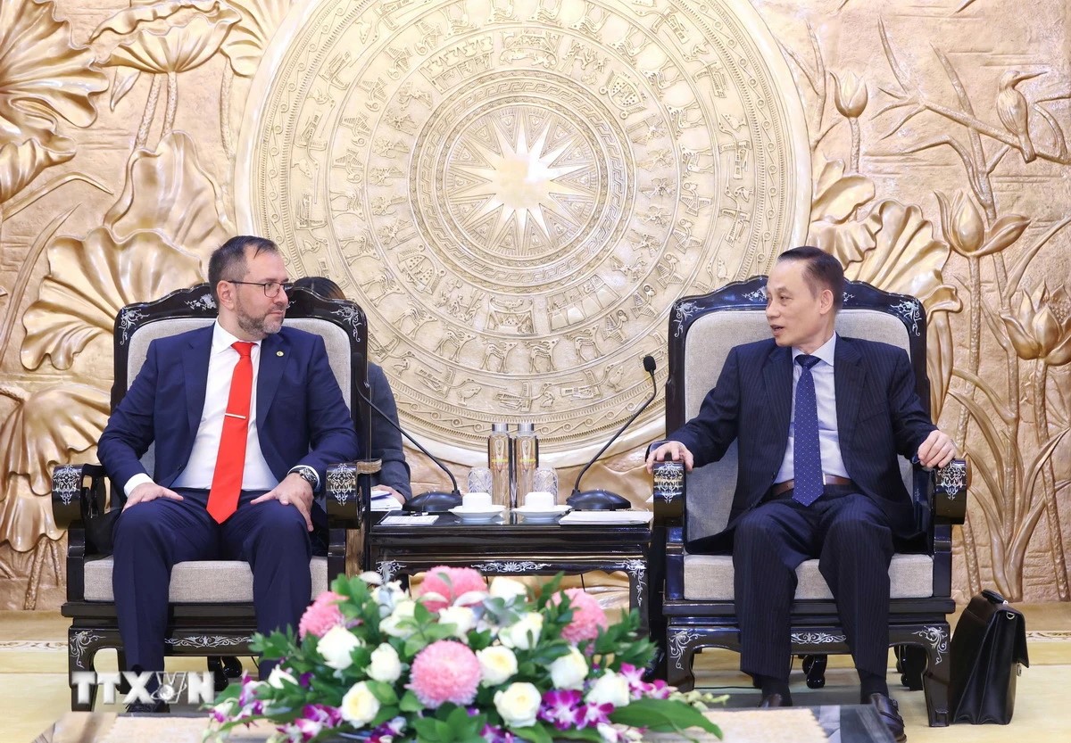 Trưởng Ban Đối ngoại Trung ương Lê Hoài Trung tiếp Bộ trưởng Ngoại giao Venezuela Yván Gil Pinto - Ảnh: Phương Hoa/TTXVN |