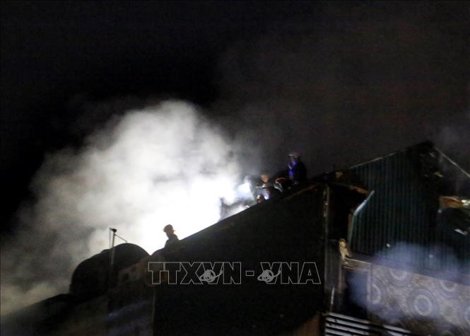 Lực lượng PCCC làm nhiệm vụ tại vụ cháy số 231 Quan Hoa (Cầu Giấy), ngày 1/8/2022. Ảnh: Phạm Kiên/TTXVN |