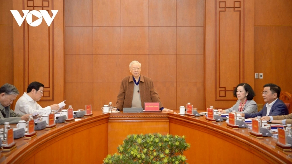 Hai là, Phải bám sát Chương trình làm việc toàn khóa của Ban Chấp hành Trung ương Đảng, Bộ Chính trị, Ban Bí thư để xây dựng và thực hiện cho bằng được chương trình công tác hằng năm, hằng quý, hằng tháng, hằng tuần theo đúng kế hoạch; đồng thời nhạy bén, linh hoạt, kịp thời điều chỉnh, bổ sung vào chương trình công tác những công việc hệ trọng, phức tạp, mới phát sinh trên các lĩnh vực để kịp thời lãnh đạo, chỉ đạo có hiệu quả toàn diện mọi hoạt động trong đời sống xã hội. Cần tiếp tục phát huy điểm mới trong nhiệm kỳ XIII, đó là: Bộ Chính trị, Ban Bí thư đã chỉ đạo tổ chức nhiều hội nghị cán bộ toàn quốc (trực tiếp, trực tuyến) để triển khai, quán triệt nhanh, đồng bộ Nghị quyết Đại hội XIII của Đảng, các nghị quyết của Trung ương và Bộ Chính trị toàn diện ở tất cả các ngành, các lĩnh vực, các địa bàn, theo cả chiều dọc và chiều ngang; thống nhất từ Trung ương đến địa phương và giữa các địa phương trong các vùng, miền. Định kỳ hằng tháng hoặc khi cần thiết, các đồng chí lãnh đạo chủ chốt đều họp để nắm bắt toàn diện, cụ thể, thực chất tình hình; trao đổi, bàn bạc, thống nhất quan điểm, chủ trương, định hướng chỉ đạo những vấn đề lớn, hệ trọng, cấp bách của Đảng, của Đất nước; đôn đốc, kịp thời tháo gỡ những khó khăn, vướng mắc, nhằm đẩy nhanh tiến độ, hiệu quả công việc đã đề ra.
