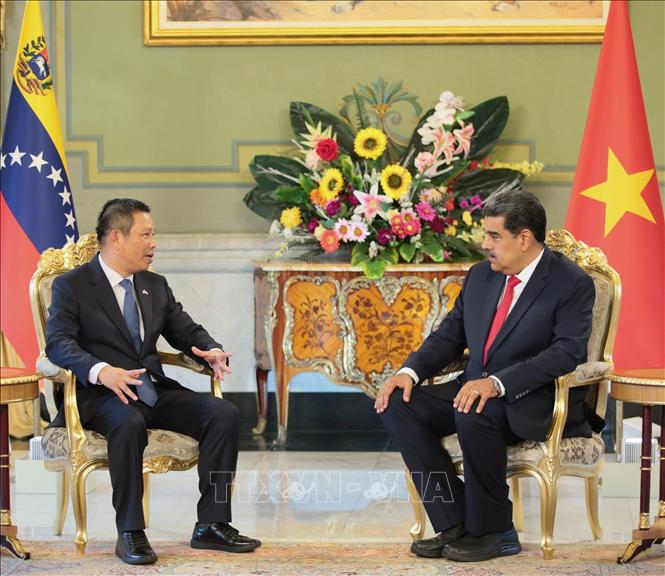 Tổng thống Venezuela Nicolás Maduro Moros tiếp Đại sứ Vũ Trung Mỹ tại Dinh Milaflores, thủ đô Caracas - Ảnh: Phi Hùng/TTXVN |
