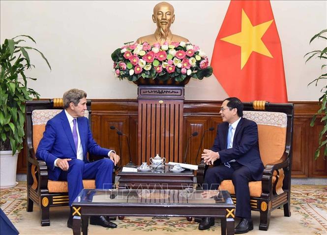 Cùng ngày, tại trụ sở Bộ Ngoại giao, Bộ trưởng Ngoại giao Bùi Thanh Sơn đã tiếp Đặc phái viên của Tổng thống Hoa Kỳ về Khí hậu John Kerry. Bộ trưởng Bùi Thanh Sơn khẳng định Việt Nam cam kết mạnh mẽ đóng góp cho nỗ lực toàn cầu ứng phó với biến đổi khí hậu, đồng thời coi đây là lĩnh vực hợp tác mang ý nghĩa chiến lược giữa hai nước. Bộ trưởng Bùi Thanh Sơn đề nghị Hoa Kỳ tiếp tục quan tâm hợp tác, hỗ trợ Việt Nam về nguồn lực, tài chính, khoa học, công nghệ và đào tạo nguồn nhân lực để thực hiện cam kết tại COP26.