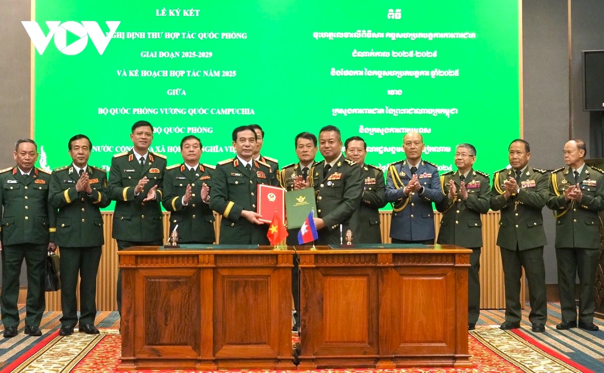 Lễ ký Nghị định thư hợp tác quốc phòng giai đoạn 2025-2029 và Kế hoạch hợp tác năm 2025 giữa hai Bộ Quốc phòng Việt Nam và Campuchia. Ảnh: PV/VOV-Phnom Penh |