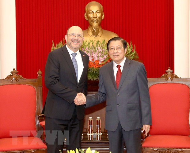 Trưởng Ban Nội chính Trung ương Phan Đình Trạc tiếp Đại sứ Thuỵ Sỹ tại Việt Nam Thomas Gass. Ảnh: Phương Hoa/TTXVN |